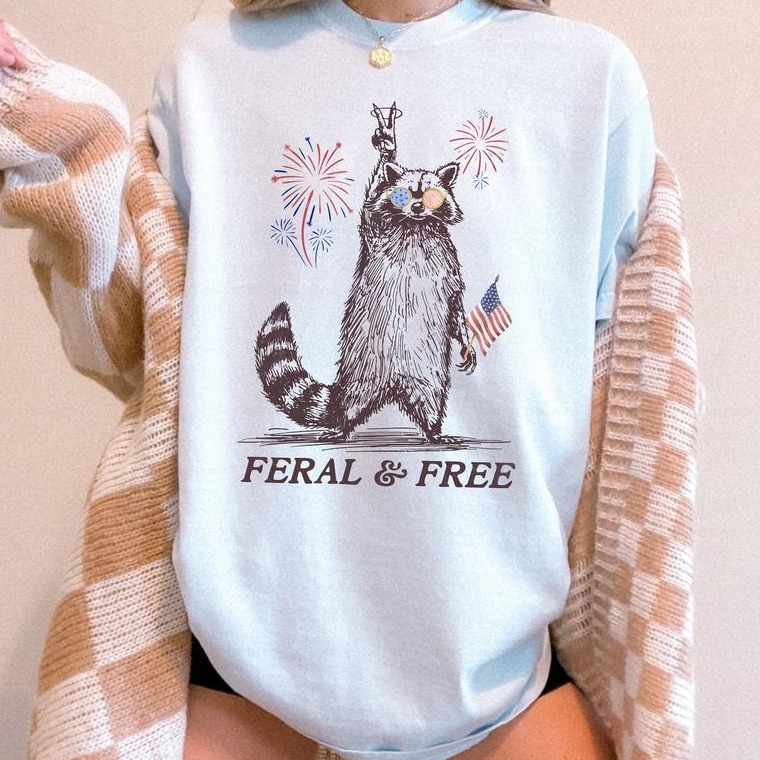Unleash your wild side! This tee features a fun raccoon—FERAL & FREE—waving the US flag and fireworks. Soft, comfy fabric. Perfect for 4th of July, outdoor lovers, or anyone chasing freedom. Wear it to show your playful, untamed spirit and patriotic pride. Stand out with a design that screams “live free”!